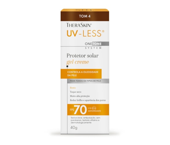 O UV-Less® TheraSkin® é um protetor solar facial FPS 70 que protege contra radiação UVA, UVB e também contra a luz azul. Seu diferencial está no fator UVA 30, um dos mais altos do mercado brasileiro, fundamental para a prevenção de manchas, melasma e sinais de envelhecimento. Tom 4 que atende à diversidade da pele brasileira. Além da proteção solar, funcionam como um protetor solar facial com base, ajudando a uniformizar a pele.