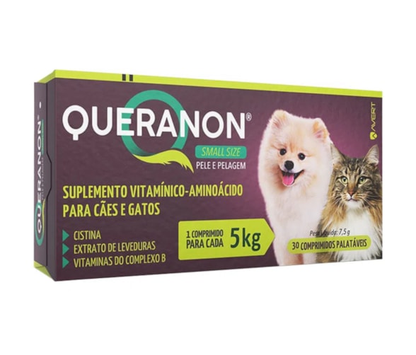 O Suplemento Vitamínico-Aminoácido Avert Queranon para Cães e Gatos de 5 Kg é composto por aminoácidos a base de cistina, pantotenato de cálcio, tiamina, extrato de leveduras e hidrolisado de fígado suíno. Esse produto é indicado para os pets de todas as idades que necessitem de aporte nutricional.