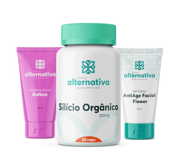 "Descubra o poder do AlterMax YoungSkin - Anti-Idade, um revolucionário kit anti-envelhecimento que combina ciência e natureza para transformar sua pele. Este conjunto exclusivo incluye: Exsynutriment 300mg 30 Cápsulas, AntiAge Facial Flower 50g, e ReNew Esfoliante Facial 60g, todos formulados para prevenir o envelhecimento, combater rugas e linhas de expressão, e manter a sua derme macia e sedosa. As cápsulas Exsynutriment são enriquecidas com silício orgânico patenteado, conhecido por promover um efeito lifting, hidratação máxima, e fortalecimento de unhas e cabelos. Além disso, estimula a síntese de colágeno e elastina, mantendo a elasticidade dos vasos sanguíneos e miocárdio.O AntiAge Facial Flower é infundido com ácido ferúlico, Biossome DMAE, e lipossomas de Coenzima Q10, oferecendo propriedades antioxidantes e proteção contra danos UV, enquanto o Floral de Bach Rescue acalma a pele. Este creme deve ser aplicado na face e pescoço duas vezes ao dia para obter melhores resultados.Por fim, o ReNew Esfoliante Facial com sementes de apricot desobstrui os poros e elimina células mortas, proporcionando uma limpeza profunda que deixa sua pele radiante. Massaje suavemente na pele durante o banho para revitalizar seu rosto com uma sensação aveludada.Este tratamento é indicado para todos os tipos de pele, porém deve-se seguir as advertências e posologia adequadas. Uso tópico e orientação médica são recomendados em caso de dúvidas. AlterMax YoungSkin é o seu aliado na busca por uma pele jovem, saudável e bem cuidada. Invista em você mesma com esta solução inovadora que une o melhor da tecnologia cosmética com ingredientes sofisticados para resultados visíveis. Não contém glúten nem lactose, e é elaboradamente formulado pela Botica Alternativa, respeitando os mais altos padrões de qualidade e segurança da ANVISA."