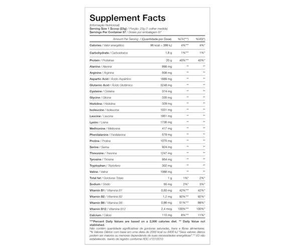 A única fonte de proteína utilizada no produto é o whey protein isolado microfiltrado com a exclusiva tecnologia SpiroFuse Reverse Osmosis Filtration (SRO). Sua fórmula conta também com tiamina (Vitamina B1), riboflavina (Vitamina B2), piridoxina (Vitamina B6) e a cianocobalamina (Vitamina B12) que auxiliam no metabolismo energético, metabolismo de proteínas, carboidratos e gorduras.