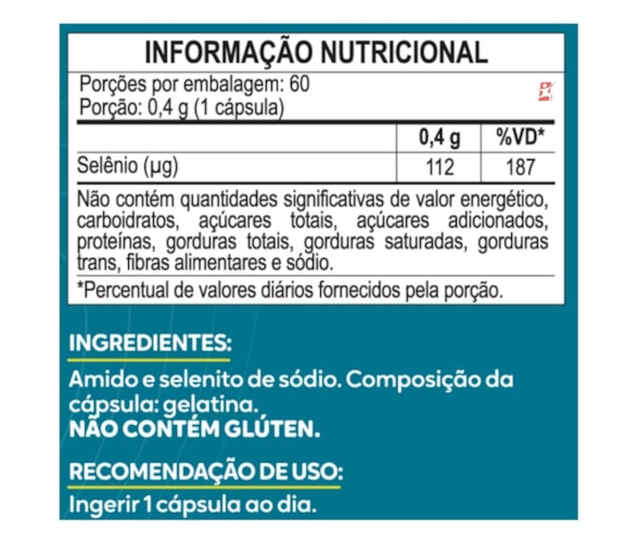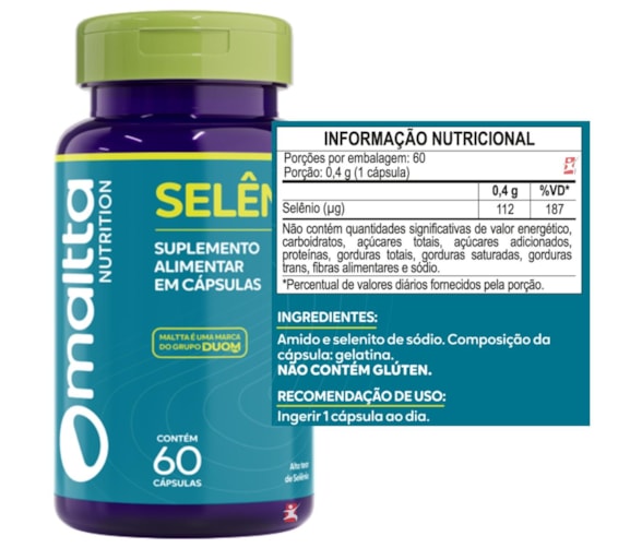 SELÊNIO SE ALTO TEOR 187% DA IDR APENAS 1 Cápsulas AO DIA 60 CÁPSULAS - MALTTA NUTRITION Selênio é um mineral extremamente vital para o corpo humano, pois aumenta a imunidade, participa na atividade antioxidante que defende contra danos e inflamações radicais e desempenha um papel fundamental na manutenção de um metabolismo saudável. De acordo com estudos, o consumo de abundante selênio natural tem efeitos antivirais positivos, é essencial para o sucesso da fertilidade e reprodução masculina e feminina e também reduz o risco de câncer, doenças autoimunes e tireoidianas.Ele é capaz de desempenhar um papel tão protetor no corpo porque aumenta as capacidades antioxidantes e a qualidade do fluxo sanguíneo, aumentando a resistência do corpo contra doenças e estresse. O selênio é frequentemente elogiado por seu papel na atividade antioxidante, que reduz o dano e a inflamação dos radicais livres.Ajuda a prevenir formas comuns de câncer, combater os vírus, se defender contra doenças cardíacas e retardar os sintomas correlacionados com outras condições graves como a asma. BENEFÍCIOS- 112mcg de Selênio por cápsula;- Apenas 1 cápsula ao dia;- Cada frascor fornece/rende 60 doses/porções (2 meses);- Antioxidante que auxilia nos danos causados pelos radicais livres;- Auxilia no combate do envelhecimento precoce;- Auxilia a melhora o sistema imunológico;- Não contém glúten. SUGESTÃO DE USOIngIngerir 1 cápsula ao dia. TABELA NUTRICIONAL & COMPOSIÇÃOEm anexo nas imagens. RECOMENDAÇÕES & CUIDADOSSelênio Quelato. SUPLEMENTO ALIMENTAR EM CÁPSULAS. Contém 60 cápsulas. ALTO TEOR DE SELÊNIO. PRODUTO INDICADO A PESSOAS ACIMA DE 19 ANOS. ESTE PRODUTO NÃO É UM MEDICAMENTO. NÃO EXCEDER A RECOMENDAÇÃO DIÁRIA DE CONSUMO INDICADA NA EMBALAGEM. MANTENHA FORA DO ALCANCE DE CRIANÇAS. DADOS TÉCNICOSMarca – Duom: MALTTA NUTRITIONConteúdo líquido total – 60 cápsulas.Rendimento total – 60 porções/doses.Peso aproximado produto + embalagem - 350g.Código de barras (EAN) – 7898665750056.Registro ANVISA – Dispensado de registro de acordo com a resolução da RDC 27/2010 e RDC 240/2018 da ANVISA.Dimensões do produto – largura: 6 cm; altura: 10 cm; comprimento: 6 cm.Dimensões da embalagem/pacote - largura: 13 cm; altura: 10 cm; comprimento: 16 cm. ITENS DO ANÚNCIO- 1 Unidade do produto: SELÊNIO SE ALTO TEOR 187% DA IDR APENAS 1 Cápsulas AO DIA 60 CÁPSULAS - MALTTA NUTRITION.Total – 60 Cápsulas POR FRASCO.