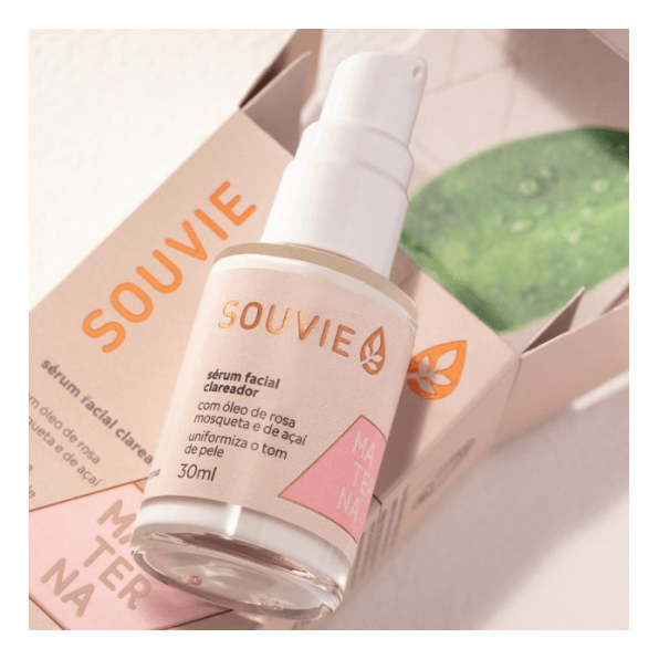 O Sérum Facial Clareador Orgânico Materna da Souvie é cuidadosamente elaborado com os óleos de açaí e rosa mosqueta orgânicos, que são excelentes antioxidantes, prevenindo o envelhecimento precoce e proporcionando uma pele renovada e saudável; os óleos de oliva e castanha do pará, que hidratam profundamente a pele; o extrato de maça, que é rico em taninos e tem uma poderosa ação antioxidante , favorecendo a rápida regeneração e recuperação da luminosidade natural; e o extrato de erva-tostão, um poderoso clareador que atua na redução da melanina cutânea, uniformizando o tom de pele. Este maravilhoso sérum auxilia o restabelecimento do tom da pele de maneira suave e uniforme, prevenindo o aparecimento de manchas profundas e superficiais, tanto em quantidade quanto em intensidade.
