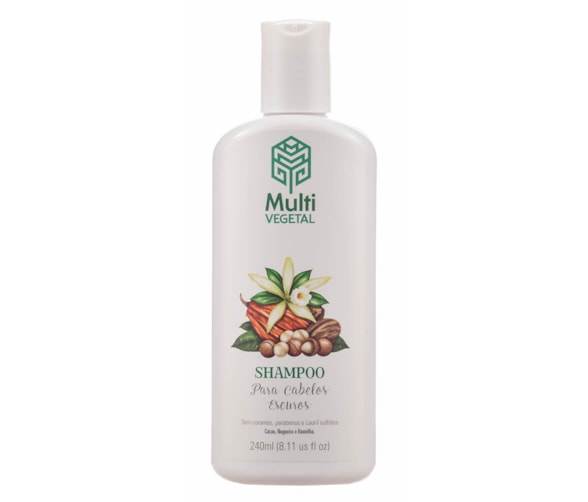 O Shampoo Natural de Nogueira, Cacau e Baunilha da Multi Vegetal é indicado para cabelos pretos naturais ou tingidos e castanhos escuros.