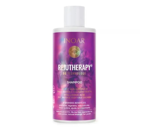 Shampoo regenerador. Inoar Rejutherapy possui uma exclusiva tecnologia 5G, preenche a fibra capilar, regenera os fios, sela cutículas e reduz a quebra. Shampoo Inoar Rejutherapy é formulado com Ácido Hialurônico, Zinco, Biotina e Colágeno Vegetal. Oferece resultados incríveis e ainda colabora para o crescimento dos fios. Conselho de Aplicação: Aplique o shampoo nos cabelos úmidos e massageie. Enxágue e se necessário repita a operação. Finalize como desejar.