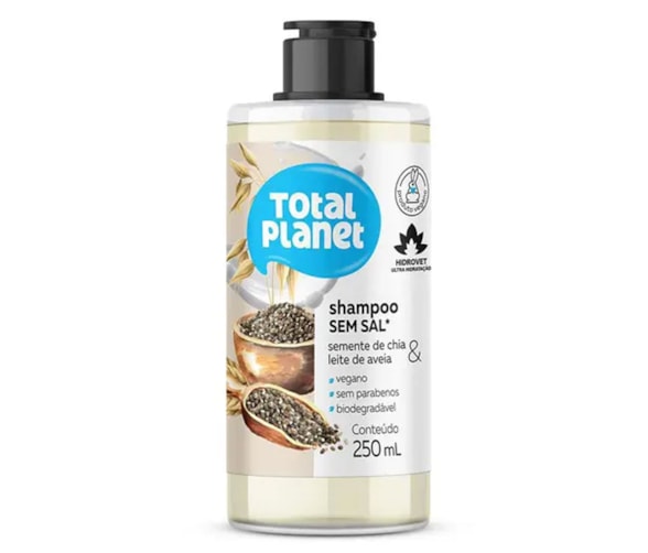 Shampoo sem Sal Semente de Chia e Leite de Aveia Total Planet 250mL - Os antioxidantes presentes na semente de Chia combatem os radicais livres e evitam o envelhecimento precoce das células do corpo - Ricas em proteínas e óleos essenciais, as propriedades do leite de aveia diminuem a irritação de peles delicadas e hidrata profundamente as peles secas.