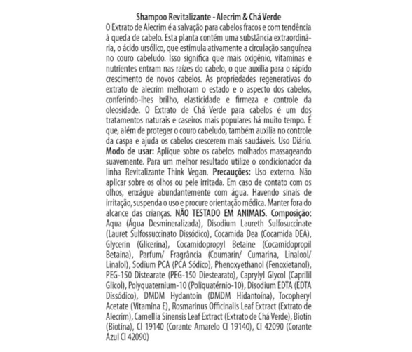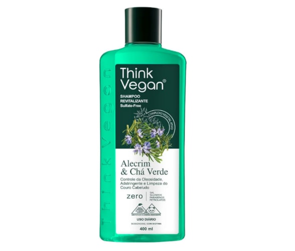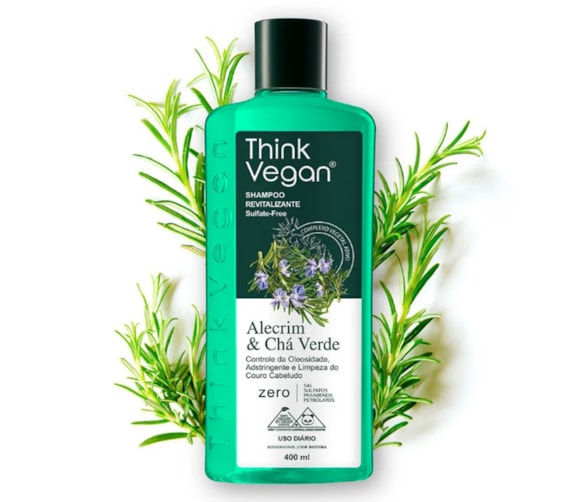 Shampoo Think Vegan Revitalizante Alecrim e Chá Verde 400mL - Extrato de Alecrim auxilia para o rápido crescimento de novos cabelos - As propriedades regenerativas do Extrato de Alecrim melhoram o estado e o aspecto dos cabelos, conferindo-lhes brilho, elasticidade, firmeza e controle da oleosidade - Extrato de Chá Verde auxilia no controle da caspa e ajuda os cabelos crescerem mais saudáveis.