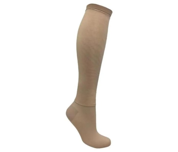 Já a meia sobreposta atinge uma compressão média de 40mmHg, ideal para esse tipo de tratamento.