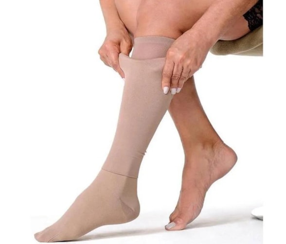 Já a meia sobreposta atinge uma compressão média de 40mmHg, ideal para esse tipo de tratamento.