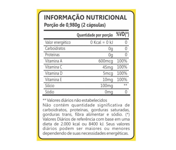 Silício, vitamina A, vitamina C, vitamina D, vitamina E, excipiente: silicato de magnésio, antiumectante: dióxido de silício, cápsula: gelatina.