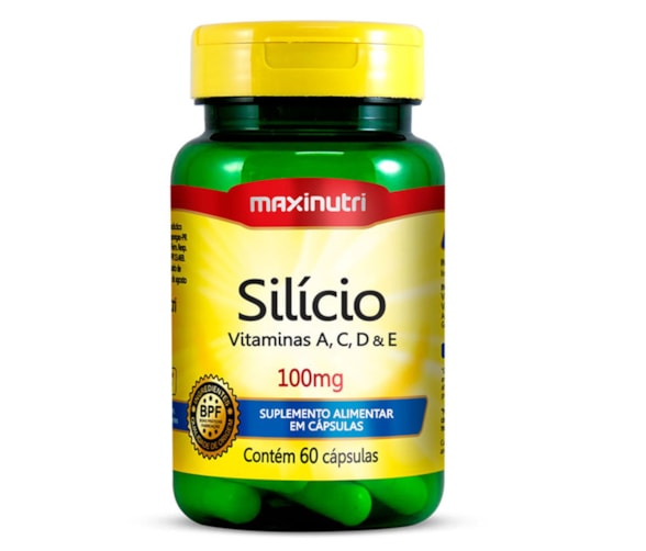 Silício +Vitaminas A, B, C D e E Maxinutri 100mg c/60 Cáps - O Silício da Maxinutri possui uma combinação exclusiva de silício + um complexo que contém as vitaminas A, C, D e E - Também conhecido como Silício orgânico, é um mineral extremamente importante presente em vários tecidos do corpo humano - É fundamental na reparação do envelhecimento da pele pois contribui para a síntese de colágeno do tipo I e elastina proporcionando reestruturação e firmeza devido a sua ação redensificadora e preenchedora de rugas.
