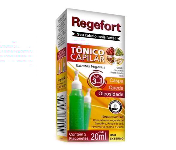 Skafe Regefort Tônico Capilar 3 em 1 - Seu cabelo mais forte - O Tônico Capilar 3 em 1 Regefort possui a combinação de Extratos Vegetais que promovem a renovação do ciclo de crescimento dos fios e auxiliam no combate à caspa, oleosidade e queda capilar.