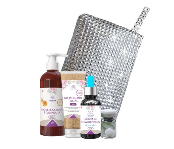 Um convite ao autocuidado, com uma seleção de produtos pensados para proporcionar uma experiência completa de cuidado facial e bem-estar. Composto por sabonete de camomila e calêndula, Gel Esfoliante Facial com Semente de Damasco (Apricot), sérum reparador e esfera de Reallagen, o kit oferece uma rotina completa para limpar, renovar, hidratar e revitalizar a pele. Tudo isso acompanhado de uma necessaire exclusiva Floracea, perfeita para guardar seus itens com charme e praticidade
