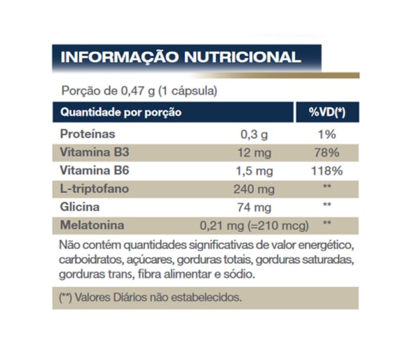 Suplemento alimentar de uso adulto (a partir de 19 anos de idade): ingerir 0,47 g (1 cápsula) diariamente, de preferência à noite após a refeição ou seguir a recomendação de um prossional da saúde