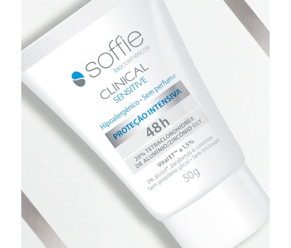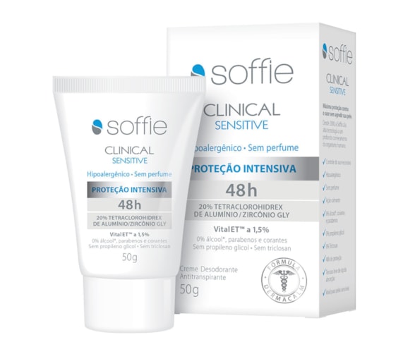 Soffie Clinical Sensitive - Creme desodorante antitranspirante proteção intensiva 48h - Sem perfume, hipoalergênico - Indicado para quem sofre com a transpiração excessiva e tem pele sensível - Sua fórmula de longa duração, ultra-suave e não-pegajosa foi especialmente desenvolvida para minimizar os riscos de alergia - Ideal para uso após a depilação das axilas - Uso recomendado para todos os tipos de pele, inclusive as mais sensíveis - Contém 20% de tetraclorohidrex de alumínio zircônio/GLY, ativo altamente eficaz no combate à transpiração.