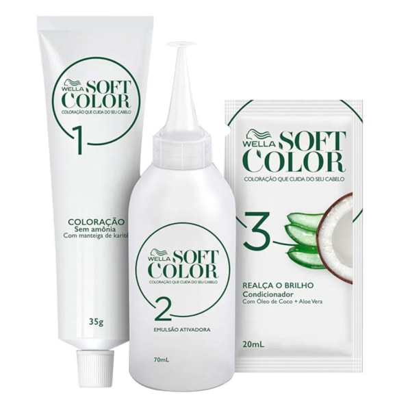 Soft Color Wella Tonalizante de Cabelo - Soft Color é a coloração que te dá reflexos com brilho radiante, 90% menos queda de fios e duração de até 28 lavagens - Sua fórmula sem amônia é compatível com cabelos quimicamente tratados - Além disso, possui ingredientes naturais como Aloe Vera, Manteiga de Karitê e Óleo de Coco que garantem cuidado com seus cabelos, cobertura perfeita dos fios brancos e brilho por até 4 semanas - O kit contém um frasco com a coloração sem amônia, uma emulsão ativadora e um sachê de condicionador que realça o brilho.