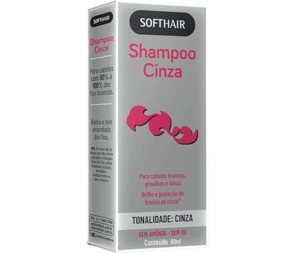 "Soft Hair - Shampoo Cinza Anti Amarelado 80 a 100% de Fios Brancos Proporciona banho de brilho e proteção para cabelos brancos, grisalhos e louros. Retira o tom amarelado dos fios. - Retira o tom amarelado dos fios;- Brilho e proteção do branco ao cinza.- Para cabelos com 80% à 100% dos fios brancos.
