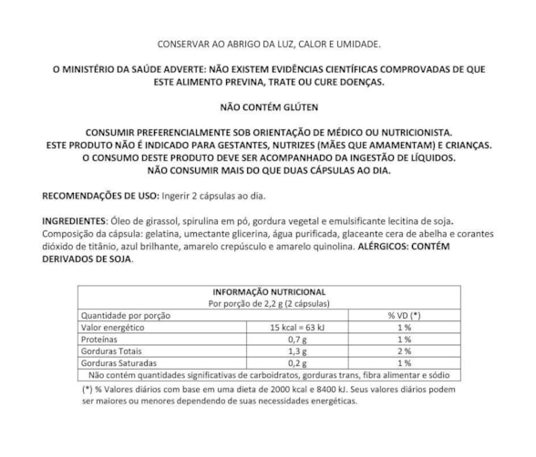 SPIRULINA A Spirulina é um tipo de microalga considerada fonte de antioxidantes devido à presença de carotenoides derivados da clorofila. Além disso, ela é rica em proteínas, ferro e algumas vitaminas, como a vitamina A e vitamina B12, podendo ser utilizada como suplemento alimentar na dieta vegetariana e durante a prática de exercícios físicos, podendo ser utilizada para emagrecer. A spirulina está indicada para o tratamento da obesidade, no controle do colesterol e diabetes, além de ser um poderoso antioxidante e anti-inflamatório, ajudando em tratamentos de doenças, sendo um poderoso fortalecedor do sistema de imunidade. Registro no Ministério da Saúde nº 6.6969.0033.002-9 Ingredientes: Óleo de girassol, spirulina em pó, gordura vegetal e emulsificante lecitina de soja. Composição da cápsula: gelatina, umectante glicerina, água purificada, glaceante cera de abelha e corantes dióxido de titânio, azul brilhante, amarelo crepúsculo e amarelo quinolina. Apresentação/Embalagem: frasco contendo 60 cápsulas gelatinosas de 1100 mg cada. Sugestão de uso: Ingerir de 1 cápsulas ao dia, juntamente com as refeições. Ingerir com auxílio de 200 ml (1 copo) de água. ALÉRGICOS: CONTÉM DERIVADOS DE SOJA. O MINISTÉRIO DA SAÚDE ADVERTE: NÃO EXISTEM EVIDÊNCIAS CIENTÍFICAS COMPROVADAS DE QUE ESTE ALIMENTO PREVINA, TRATE OU CURE DOENÇAS. NÃO CONTÉM GLÚTEN. CONSUMIR PREFERENCIALMENTE SOB ORIENTAÇÃO DE MÉDICO OU NUTRICIONISTA. ESTE PRODUTO NÃO É INDICADO PARA GESTANTES, NUTRIZES (MÃES QUE AMAMENTAM) E CRIANÇAS. O CONSUMO DESTE PRODUTO DEVE SER ACOMPANHADO DA INGESTÃO DE LÍQUIDOS. NÃO CONSUMIR MAIS DO QUE DUAS CÁPSULAS AO DIA.