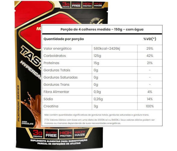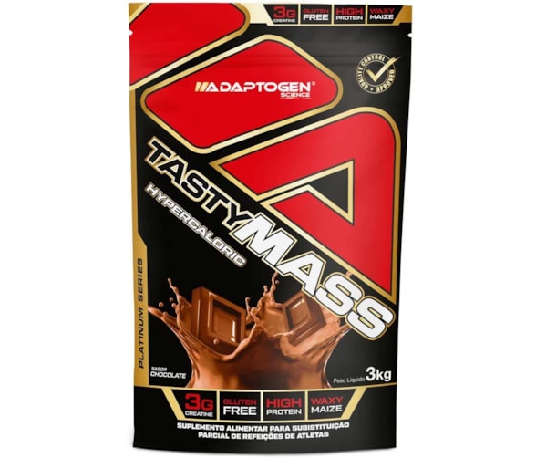 O Tasty Mass da Adaptogen é um hipercalórico indicado para quem deseja aumentar o peso corporal através de ganho de massa muscular e buscam alcançar a hipertrofia. Como é uma fonte calórica de proteínas e carboidratos de alta qualidade, além da creatina presente em sua composição, a suplementação com o hipercalórico Tasty Mass auxilia no aumento da intensidade do treinamento, proporcionando ao atleta chegar a níveis nunca antes alcançados. O hipercalórico Tasty Mass é indicado principalmente para atletas que buscam um off season aonde o peso corporal e a carga de treinamento aumentem nos maiores níveis possíveis. • Sem glúten • Waxy Maize • Extremamente Saborosa • Alto teor Protéico • 3g Creatina • Auxilia no ganho de massa muscular Auxilia ganho rápido de força e peso corporal Melhora o desempenho muscular Fonte de proteínas e carboidratos de alta qualidade Otimização da recuperação muscular INSTRUÇÕES DE USO Diluir 150 g (4colheres medida) em 350ml de água ou leite. Consumir uma vez ao dia antes do treino ou conforme orientação profissional.