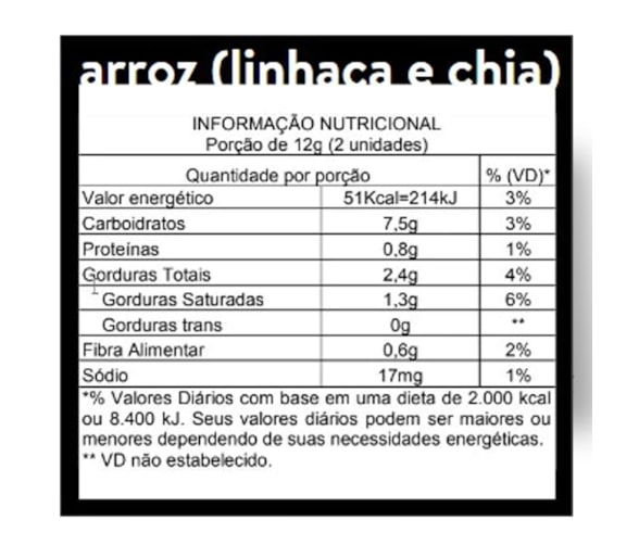 ARROZ INTEGRAL, COBERTURA SABOR CHOCOLATE MEIO AMARGO ZERO AÇÚCARES (GORDURA FRACIONADA, CACAU EM PÓ, MASSA DE CACAU, EDULCORANTE NATURAL MALTITOL, EMULSIFICANTE LECITINA DE GIRASSOL E AROMA NATURAL DE BAUNILHA), CHIA, LINHAÇA E SAL.