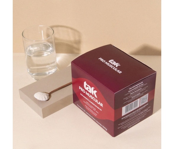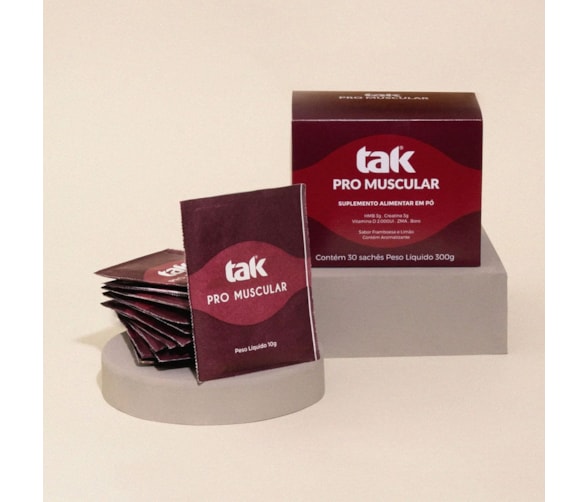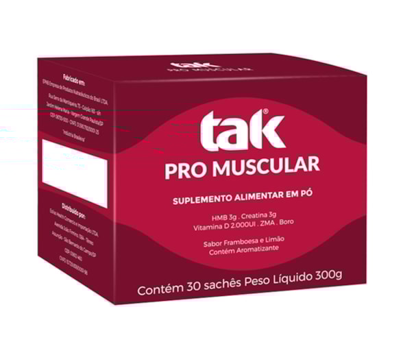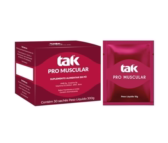 TAK PRO MUSCULAR é um produto completo com ingredientes que previnem ou retardam sintomas iniciais e agudos da Sarcopenia (perda de massa muscular) - Também tem ação positiva em atletas que buscam aumento de sua performance, ou mesmo não atletas que treinam para ganho de massa muscular.