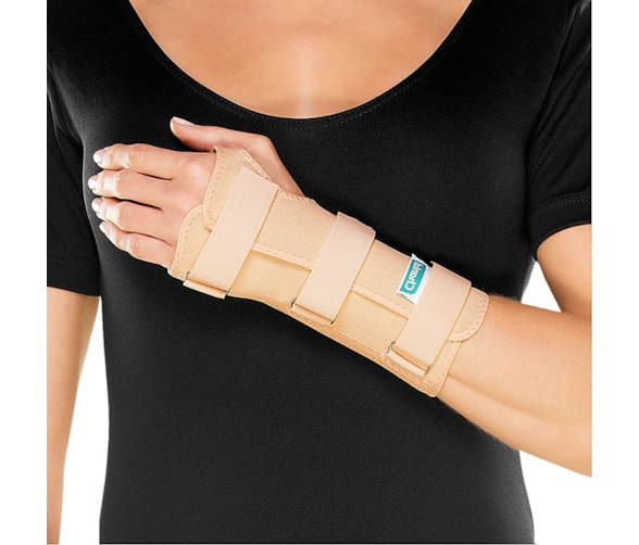Confeccionada em lona dupla resistente, tala em plástico rígido (ABS), leve e resistente, que não resseca ou quebra com o passar do tempo, que acompanha a anatomia da região do punho.