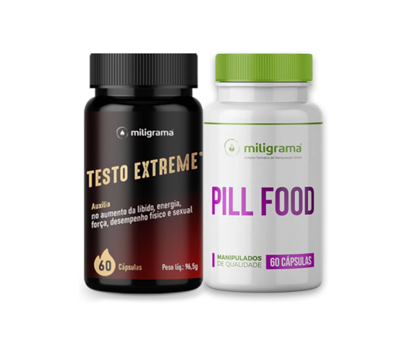 O Kit Testo Extreme + Pill Food é um combo de nutrientes para o desempenho físico e sexual junto com o tratamento para cabelo, pele e unhas. Ambos são complexos vitamínicos e minerais que aumentam a nutrição do organismo promovendo melhora nas reações bioquímicas e fisiológicas resultando tanto em saúde e desempenho, quanto beleza e bem estar. O Testo Extreme é indicado tanto para homens quanto mulheres que procuram aumentar o desempenho físico e sexual pois promove melhora na vasodilatação e aumento da testosterona endógena. Já o Pill Food é um suplemento que ajuda homens e mulheres a alcançarem uma melhor aparência da pele, cabelos e unhas, promovendo fortalecimento e controle da queda dos fios juntamente com aumento na hidratação.