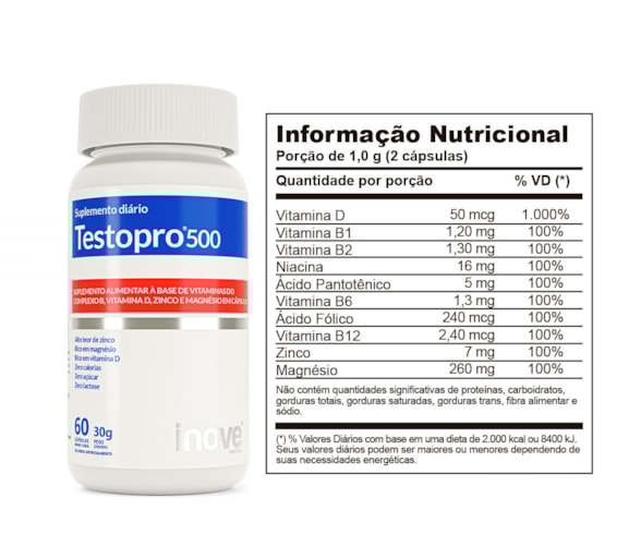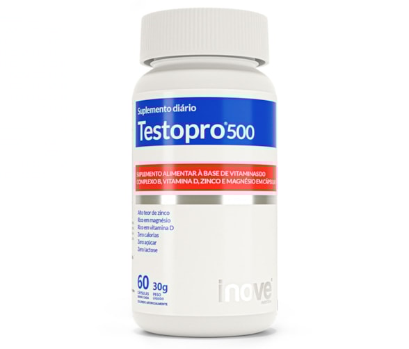 O Testopro500 da Inove Nutrition é uma fórmula de vitaminas e minerais com concentrações ideias para repor nutrientes importantes para o metabolismo masculino - O Testopro500 Inove Nutrition é bom para reabastecer o organismo com nutrientes importantes que auxiliam no metabolismo energético do homem, ativando várias funções do organismo.