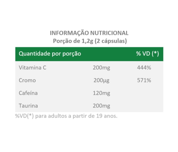Ingredientes: ácido ascórbico revestido (vitamina C), taurina, cafeína anidra em pó, picolinato de cromo, agente de massa celulose microcristalina, antiumectante estearato de magnésio e dióxido de silício e antioxidante ácido cítrico anidro. Componentes da cápsula: gelificante gelatina, umectante glicerina e corantes INS 171, INS 110 e INS 129. Colorido artificialmente.