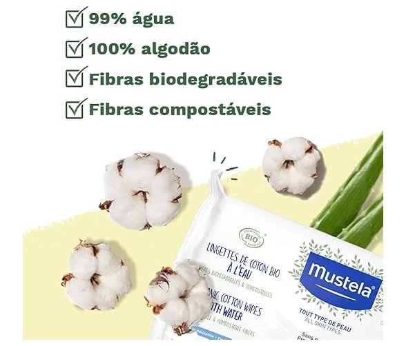 As Toalhas de Algodão BIO Mustela são compostas por fibras 100% naturais, com 99,8% de ingredientes de origem natural e 99% de água purificada. Feitas com Aloe Vera e algodão orgânico, essas toalhas são suaves, hidratantes e ideais para a limpeza delicada da pele do bebê.