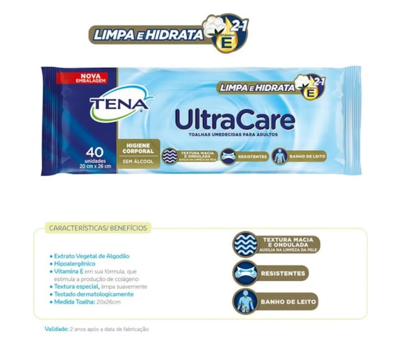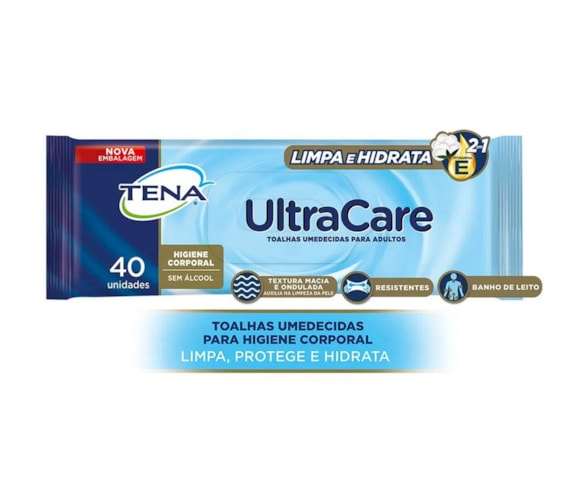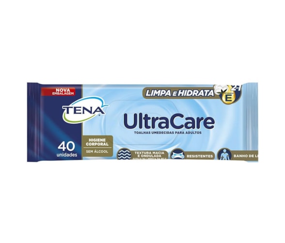 Toalhas Umedecidas Tena UltraCare c/40 Toalhinhas - TENA WIPES toalhas umedecidas para adultos foram especialmente desenvolvidas para a higiene, podendo ser usada em todo o corpo, proporcionando mais praticidade e conforto.