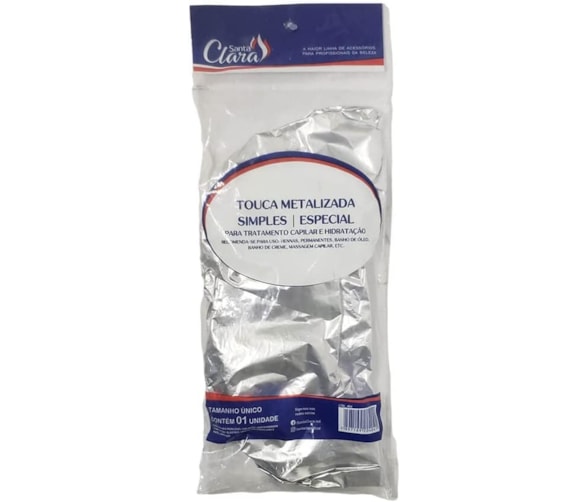 Touca Santa Clara Metalizada Simples Especial Santa Clara é indicada para o uso de hidratação capilar, procedimentos químicos, banho de óleo, alisamentos e massagem capilar. Também pode ser usada no banho.