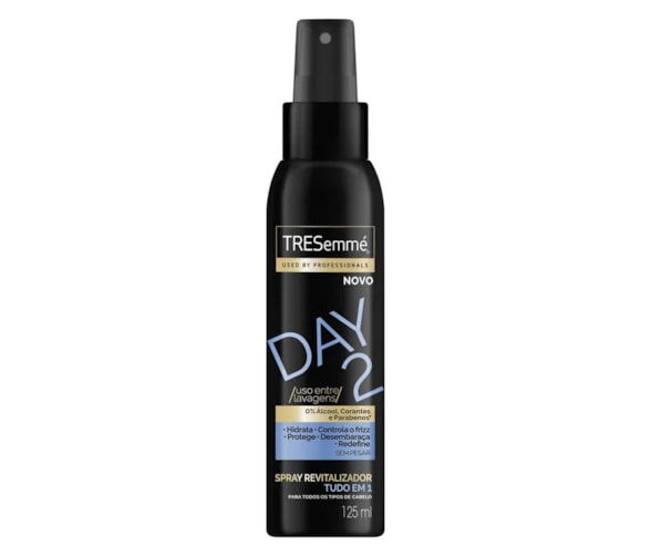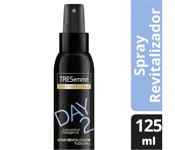 TRESemmé Spray Revitalizador Day 2 125mL - A linha TRESemmé Day 2 é ideal para aqueles dias que lavar o cabelo não está nos seus planos, pois ela foi profissionalmente desenvolvida para prolongar ou recriar seu look entre lavagens - O Spray Revitalizador Tudo em 1 hidrata, desembaraça, controla o frizz, protege contra o calor e redefine a forma, sem pesar, para você ter um look com acabamento profissional - Sua fórmula leve foi profissionalmente desenvolvida para oferecer multibenefícios em um só produto que não pesa nos fios - Além disso, não contém álcool, parabenos e corantes e é ideal para quem deseja recriar o look entre as lavagens, pois ele te ajuda a revitalizar, redenir e controlar os cabelos entre as lavagens - Pode ser usado em todos os tipos de cabelo.