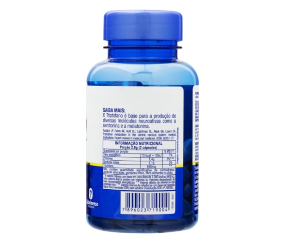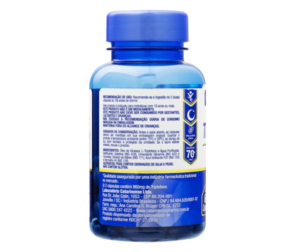 Óleo de Girassol, L-Triptofano e Água Purificada; Gelificante: Gelatina (INS 428), Umectante Glicerina (INS 422) e Corantes: Dióxido de titânio (INS 171), Azul brilhante FCF (INS 133) e Vermelho 40 (INS 129). ALÉRGICOS: PODE CONTER DERIVADOS DE SOJA E PEIXE. NÃO CONTÉM GLÚTEN.