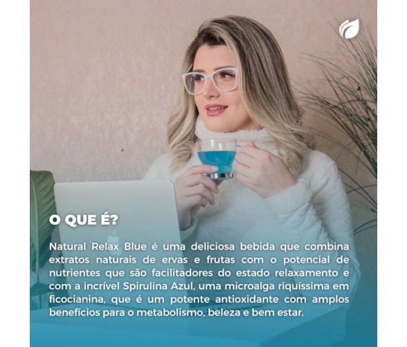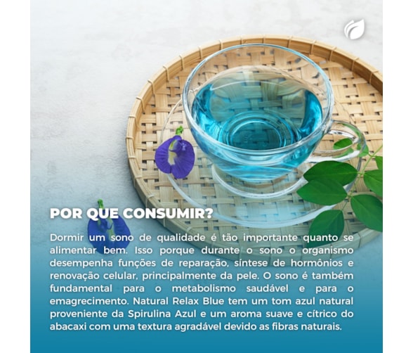 Natural Relax Blue é um chá , para ser servido quente ou frio, desenvolvido para fazer parte da Rotina diária para o bem -estar, oferece ao corpo nutrientes que colaboram com o relaxamento e a calma. Melhora o humor, aumenta a disposição, auxilia nos distúrbio do sono, atenua os sintomas da TPM e menopausa, auxilia o funcionamento neuro muscular, promove calma e resiliência.