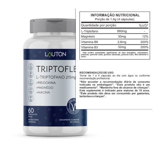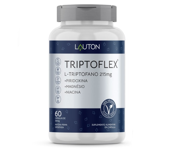 Triptoflex Lauton 215mg c/60 Comprimidos - Ajuda a melhorar tanto a qualidade, quanto prolongar a duração do sono -Estimula o a liberação do GH, o hormônio do crescimento - Ajuda a controlar os sintomas da TPM, estabilizando as oscilações de humor - Controla o apetite, auxiliando no emagrecimento e reduz a vontade de comer carboidratos - Reduz os sintomas associados ao estresse e à ansiedade, uma vez que pode diminuir a secreção de cortisol, o hormônio do estresse.