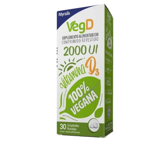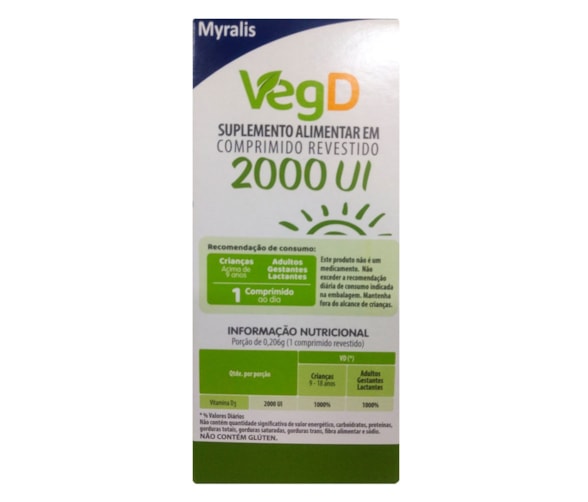 Veg D é um suplemento alimentar de Vitamina D3. A Vitamina D3 auxilia na formação de ossos e dentes, absorção de cálcio e fósforo, funcionamento do sistema imune e muscular. 100% vegana. Recomendação de consumo: 2000UI. Crianças acima de 9 anos, adultos, gestantes e lactantes: 1 comprimido ao dia. Este produto não é um medicamento. Não exceder a recomendação diária de consumo indicada na embalagem. NÃO CONTÉM GLÚTEN.