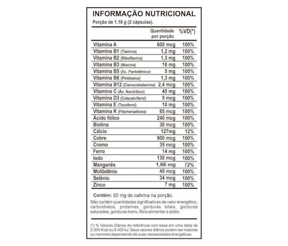 Guaraná em pó (Paullinia cupana), vitamina A, vitamina B1, vitamina B2, vitamina B3, vitamina B5, vitamina B6, vitamina B12, vitamina C, vitamina D3, vitamina E, vitamina K, ácido fólico, biotina, cálcio, cobre, cromo, ferro, iodo, manganês, molibdênio, selênio e zinco, excipiente: silicato de magnésio, antiumectante: dióxido de silício, cápsula: gelatina e corantes: amarelo 10, azorrubina, vermelho 40 e dióxido de titânio. NÃO CONTÉM GLÚTEN