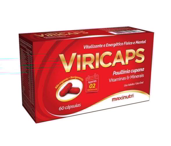 Suplemento Viricaps Guaraná mais Polivitamínico 100% IDR com 60 cápsulas - O Viricaps é um suplemento polivitamínico e mineral associado a Paullinia cupana, o guaraná, que supre 100% das necessidades diárias recomendadas com uma dose diária, com propriedades estimulantes e energéticas - Os principais constituintes da Paullinia cupana são as metilxantinas, principalmente a cafeína - Na circulação central, a cafeína reduz o fluxo sanguíneo que chega ao cérebro, sendo assim útil em casos de cefaleia.