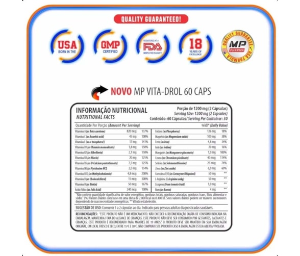 VITA-DROL - NOVA FÓRMULA MAXEFFECT Ultra complexo vitamineral! - Energia mental e física - Alto teor antioxidante - Imunidade blindada VITA-DROL fornece um espectro amplo de vitaminas e minerais para promover o suporte imunológico e elevar os níveis de energia em atletas que treinam pesado. Composto apenas de ingredientes puros, VITA-DROL ajuda a manter um metabolismo saudável, contribui na produção de energia celular e é essencial para a função cognitiva. Com o tempo, músculos, tendões e ligamentos demoram mais para se recuperar, o que significa que você não pode treiná-los com a frequência que gostaria. O suporte nutricional é a chave para obter os melhores resultados de seu treinamento, VITA-DROL COM TECNOLOGIA DE MINERAIS QUELADOS Minerais Quelados são fundamentais para causar a ligação de elementos metálicos por ácidos orgânicos fracos, por exemplo, aminoácidos que permitem a absorção adequada de elementos do sistema digestivo e sua respectiva distribuição às funções vitais que os utilizam. Os minerais de compostos inorgânicos simples são efetivamente inassimiláveis e são absorvidos na medida em que são capazes de formar QUELATOS com substâncias provenientes dos alimentos consumidos ao mesmo tempo. A FÓRMULA ÚNICA DIÁRIA COMBINA 2 FASES: - VITAMINAS E MINERAIS: Um concentrado de vitaminas puras A, complexo B, C, D, E que proporcionam a saúde hepática e prostática. Este composto abrande também bioflavonoides cítricos que podem eliminar os radicais livres e fortalecer o efeito antioxidante da viamina C. - BOOSTER SUPPORT: SELÊNIO - Tem grande poder antioxidante, que contribui para defesa das células do nosso corpo contra os malefícios provocados pelos radicais livres. Também ajuda na síntese de hormônios da tireóide, que é responsável pelo metabolismo no organismo, além de auxiliar no reforço do sistema imune. ZINCO - Importante mineral antioxidante, estimulante do sistema imune e fornece mais energia. ARGININA - Melhora o desempenho nas atividades físicas e reduz a fadiga muscular. BORO - Favorece o aumento de massa muscular, induz a uma maior produção de testosterona, melhora a habilidade de pensar, diminui inflamações no corpo e otimiza a coordenação muscular. VITA-DROL: COMPLEMENTO DE TREINO ESSENCIAL O VITA-DROL é essencial para preservar a imunidade e outros efeitos imperceptíveis e já estudados pela medicina avançada. Para um atleta, a comuda é a 1º fonte de material de construção (proteínas) e energia (carboidratos e gorduras). Entretanto, além desses 3 grupos, existem diversas micro-substãncias nutricionais nos alimentos como vitaminas e minerais que não são absorvidas em dietas e por isso precisam serem complementadas para um efetivo funcionamento dos processos vitais, em especial o imunilógico, melhorando assim a adaptação do corpo às condições físicas. SUGESTÃO DE USO: Consumir 1 a 2 cápsulas ao dia. Indicado para pessoas adultas diagnosticadas saudáveis.