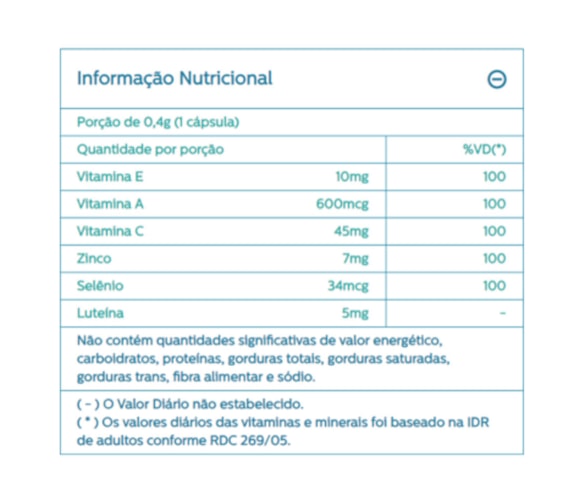 Sua fórmula é composta por Vitaminas A, C e E, além de Luteína, Zinco e Selênio.Quando combinados, esses nutrientes auxiliam no funcionamento do sistema imune, na proteção dos danos causados pelos radicais livres.