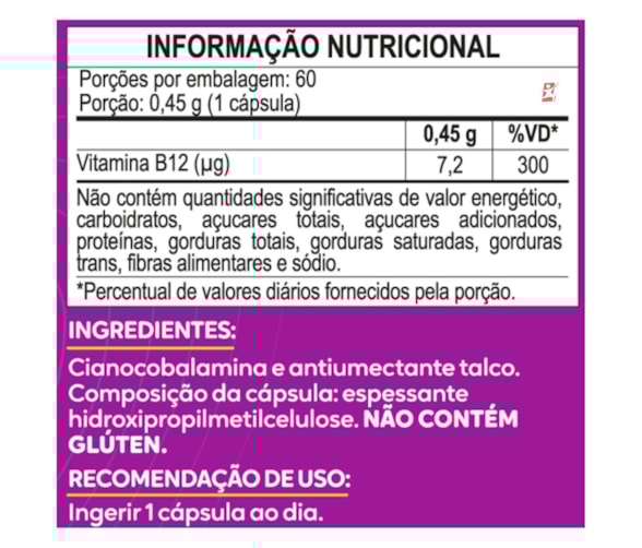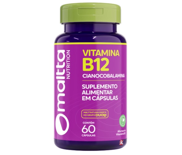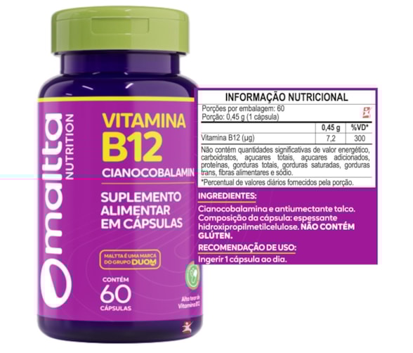 VITAMINA B12 CIANCOBALAMINA 1 CÁPSULA VEGANA AO DIA 60 CÁPSULAS - DUOM: MALTTA NUTRITIONA vitamina B-12 (cianocobalamina) é uma vitamina hidrossolúvel necessária para a manutenção de um sistema nervoso saudável e para a produção de energia a partir de gorduras e proteínas.A vitamina B-12 também é essencial para a síntese do DNA durante a divisão celular e, portanto, é especialmente importante para a multiplicação rápida de células, como as células do sangue.A Vitamina B12 auxilia na formação de células vermelhas do sangue e no processo de divisão celular. Auxilia no funcionamento do sistema imune. Auxilia no metabolismo energético, dos carboidratos, proteínas, gorduras e da homocisteína. BENEFÍCIOS- Apenas 1 cápsula ao dia;- Cada frasco fornece/rende: 60 doses/porções (2 meses);- Saúde do Sistema Nervoso;- Essencial para produção de energia;- Reforça as células do cérebro e o tecido nervoso;- Suplemento alimentar;- Adequado para vegetarianos/veganos;- Vegano. SUGESTÃO DE USOIngerir 1 cápsula ao dia. RECOMENDAÇÕES & CUIDADOSVitamina B12 Cianocobalamina. SUPLEMENTO ALIMENTAR DE VITAMINA B12 EM CÁPSULAS. Contém 60 cápsulas. ALTO TEOR DE VITAMINA B12. CÁPSULA VEGETARIANA. PRODUTO INDICADO A PESSOAS ACIMA DE 19 ANOS. ESTE PRODUTO NÃO É UM MEDICAMENTO. NÃO EXCEDER A RECOMENDAÇÃO DIÁRIA DE CONSUMO INDICADA NA EMBALAGEM. MANTENHA FORA DO ALCANCE DE CRIANÇAS. DADOS TÉCNICOSMarca – Duom: MALTTA NUTRITION.Conteúdo líquido total – 60 cápsulas.Rendimento total – 60 porções/doses.Peso líquido total – 27g.Peso bruto total – 40g.Peso aproximado produto + embalagem - 300g.Código de barras (EAN) – 7898958836887.Registro ANVISA – Dispensado de registro de acordo com a resolução da RDC 27/2010 da ANVISA.Dimensões do produto – largura: 6 cm; altura: 10 cm; comprimento: 6 cm.Dimensões da embalagem/pacote - largura: 13 cm; altura: 7 cm; comprimento: 16 cm. ITENS DO ANÚNCIO- 1 Unidade do produto: VITAMINA B12 CIANCOBALAMINA 1 CÁPSULA VEGANA AO DIA 60 CÁPSULAS - DUOM: MALTTA NUTRITION.Total – 60 cápsulas POR FRASCO.
