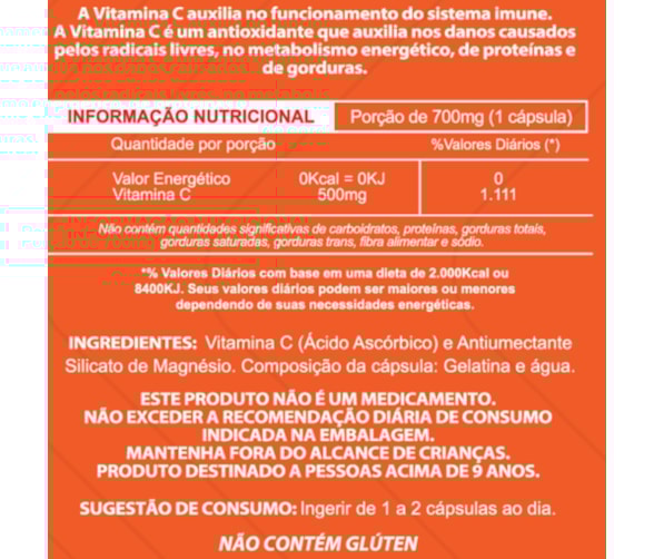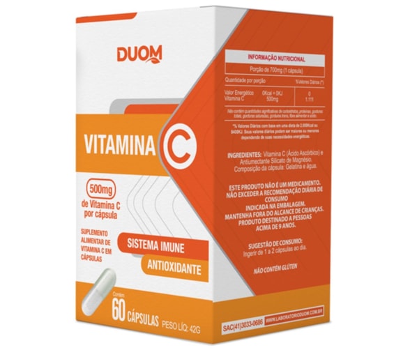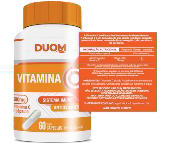 VITAMINA C CONCENTRADA 500MG SISTEMA IMUNE ANTIOXIDANTE 1 AO DIA 60 CÁPSULAS - MALTTA NUTRITION A vitamina C auxilia no funcionamento do sistema imune. A Vitamina C é um antioxidante que auxilia nos danos causados pelos radicais livres, no metabolismo energético, de proteínas e gorduras.As vitaminas são essenciais para diversas funções do nosso organismo. A vitamina C é uma das mais famosas e reconhecidas, porque está associada à prevenção de diversas doenças e à melhora do sistema imunológico. - Porque Tomar Vitamina C? -A vitamina C é hidrossolúvel, ou seja, pode ser ingerida diretamente com água e é absorvida com facilidade pelo corpo. A ingestão garante a participação de diversas ações bioquímicas de extrema importância para o organismo. No caso de quem pratica exercícios físicos intensos, a vitamina C auxilia, por meio de sua forte ação antioxidante, no combate aos radicais livres. Isso ajuda na manutenção do equilíbrio e na renovação celular, garantindo proteção ao corpo e mais saúde ao indivíduo. - Para os Atletas -A prática intensa de exercícios físicos, especialmente os aeróbicos, gera o estresse oxidativo do organismo, propiciando a formação de radicais livres e espécies reativas de oxigênio. Esses elementos precisam estar presentes no corpo, já que são importantes por vários motivos.Entretanto, quando o organismo não é capaz de equilibrar a produção e o combate à tais elementos, podemos observar lesões musculares e danos às membranas celulares. Tudo isso resulta em prejuízo ao desempenho e resultado dos atletas. BENEFÍCIOS- Promove a saúde do sistema imunológico;- Poderoso Antioxidante;- Ajuda na defesa do organismo;- Auxilia a absorção de ferro dos alimentos;- Auxilia na proteção dos danos causados pelos radicais livres;- Auxilia na formação do colágeno;- Auxilia no metabolismo de energia, proteínas e gorduras;- Apenas 1 cápsula ao dia;- Cada frasco fornece: 60 doses/porções - 2 meses. SUGESTÃO DE USOIngerir de 1 cápsula ao dia. SINERGIA DE VITAMINAS E MINERAISExcelente associação com ferro, vitamina A, zinco e magnésio. DADOS TÉCNICOSMarca – Duom: Maltta Nutrition.Conteúdo líquido total – 60 cápsulas.Rendimento total – 60 doses/porções.Peso líquido total – 43,2g.Peso bruto total – 75g.Peso para envio - produto + embalagem (aproximado) - 150g.Código de barras (EAN) – 7898665751176.Registro ANVISA – Dispensado de registro de acordo com a resolução da RDC 27/2010 da ANVISA.Dimensões do produto – altura 10 cm; largura 6 cm; comprimento 6 cm.Dimensões da embalagem padrão – altura 7 cm; largura 13 cm; comprimento 16cm. ITENS DO ANÚNCIO1 Unidade do produto: VITAMINA C CONCENTRADA 500MG SISTEMA IMUNE ANTIOXIDANTE 1 AO DIA 60 CÁPSULAS - MALTTA NUTRITION.Total – 60 cápsulas POR FRASCO.