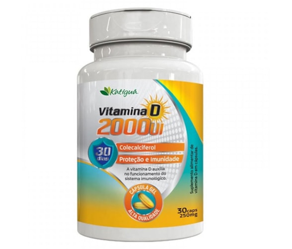 Vitamina D 2000UI Katiguá 250mg c/30 Cápsulas - A Vitamina D (colecalciferol) 2000 UI da Katiguá possui alta concentração - Com 1000% do índice diário recomendado, este suplemento oferece para você diversos benefícios da vitamina D, entre eles: