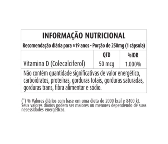 Vitamina D e óleo de girassol Cápsula: gelatina e umectante glicerina