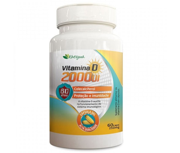 Vitamina D 2000UI Katiguá 250mg c/60 Cápsulas - A Vitamina D (colecalciferol) 2000 UI da Katiguá possui alta concentração - Com 1000% do índice diário recomendado, este suplemento oferece para você diversos benefícios da vitamina D, entre eles:
