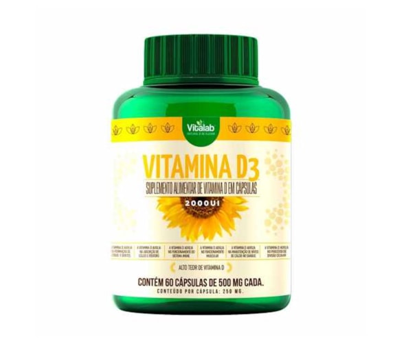 Vitamina D 2000UI Vitalab c/60 Cápsulas - Ajuda a regular os níveis sanguíneos de cálcio e fósforo, aumentando a absorção destes minerais para desenvolver os ossos do corpo.