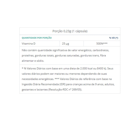 1 cápsula ao dia, atende a 500% da IDR (ingestão diária recomendada para crianças acima de 9 anos, adultos, gestantes e lactantes).
