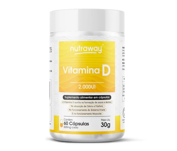 Vitamina D NutraWay 2000mg c/60 Cápsulas - A vitamina D (colecalciferol) é lipossolúvel e sua principal ação é regular o fornecimento de cálcio e fósforo ao organismo - Auxilia na formação de ossos e dentes - Na absorção de cálcio e fosforo - No funcionamento de sistema imune - No funcionamento muscular.