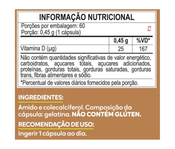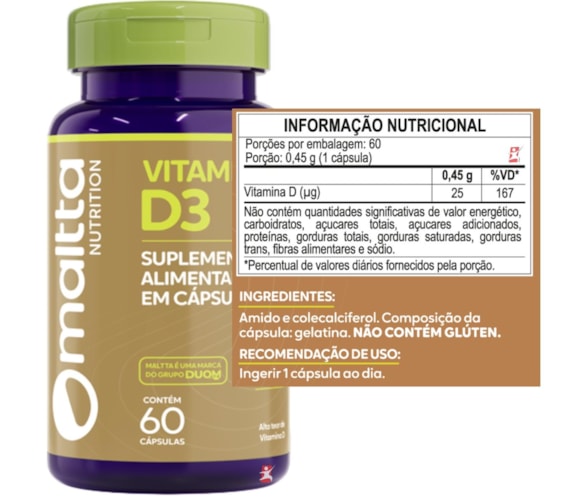 VITAMINA D3 1000UI COLECALCIFEROL 1 CÁPSULA AO DIA COM 60 CÁPSULAS – DUOM: MALTTA NUTRITION 1000UI Vitamina D por cápsula. ALTO TEOR DE VITAMINA D. A Vitamina D auxilia na formação de ossos e dentes, na absorção de cálcio e fósforo, no funcionamento do sistema imune e muscular e na manutenção de níveis de cálcio no sangue. BENEFÍCIOS- 1000UI por cápsula;- Apenas 1 cápsulas ao dia;- Auxilia na formação de ossos e dentes;- Auxilia na absorção de cálcio e fósforo;- Auxilia no funcionamento do sistema imune;- Auxilia no funcionamento muscular;- Selo eureciclo. SUGESTÃO DE USOIngerir 1 cápsula ao dia. DADOS TÉCNICOSRegistro ANVISA – Produto de acordo com a RDC 27/2010 e RDC 240/2018.Marca – Duom: MALTTA NUTRITION.Conteúdo líquido total – 60 Cápsulas.Rendimento líquido total – 60 doses/porções.Peso líquido total – 27g.Peso bruto total – 58g.Peso produto + embalagem (aproximado) – 150g.Código de barras (EAN) – 7898938440783.Dimensões do produto – altura 12 cm; largura 6 cm; comprimento 6 cm.Dimensões da embalagem padrão – altura 7 cm; largura 13 cm; comprimento 16cm. ITENS DO ANÚNCIO1 UNIDADE DO PRODUTO: VITAMINA D3 1000UI COLECALCIFEROL 1 CÁPSULA AO DIA COM 60 CÁPSULAS – DUOM: MALTTA NUTRITION.Total – 60 Cápsulas POR FRASCO.