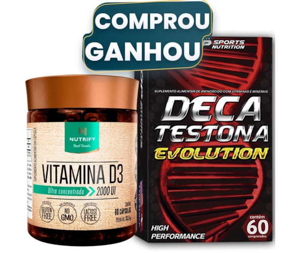 Vitamina D3 Nutrify reúne a forma ativa da vitamina e os triglicerídeos de cadeia média, resultando em formulação de elevada absorção. Fornece 50 mcg de colecalciferol. A Vitamina D é conhecida por auxiliar em diversas funções do organismo: formação de ossos e dentes, absorção de cálcio e fósforo, funcionamento do sistema imune, manutenção de níveis de cálcio no sangue, funcionamento muscular, processo de divisão celular. Benefícios • Auxilia no funcionamento do sistema imune • Ajuda na formação de ossos e dentes • Potencializa a absorção de cálcio e fósforo • Contribui para o funcionamento muscular O DECA TESTONA EVOLUTION te auxilia em seus objetivos de melhorar níveis, promovendo benefícios direto em seus treinos, fornecendo mais força, energia, resistência, definição e regeneração muscular pós esforço. Com Deca Testona Evolution seus objetivos serão alcançados com mais rapidez e segurança, pois a sua nova formulação exclusiva melhora a síntese proteica, favorecendo o aumento da massa muscular, auxiliando na diminuição dos percentuais de gordura, fornecendo mais energia em seus treinos.